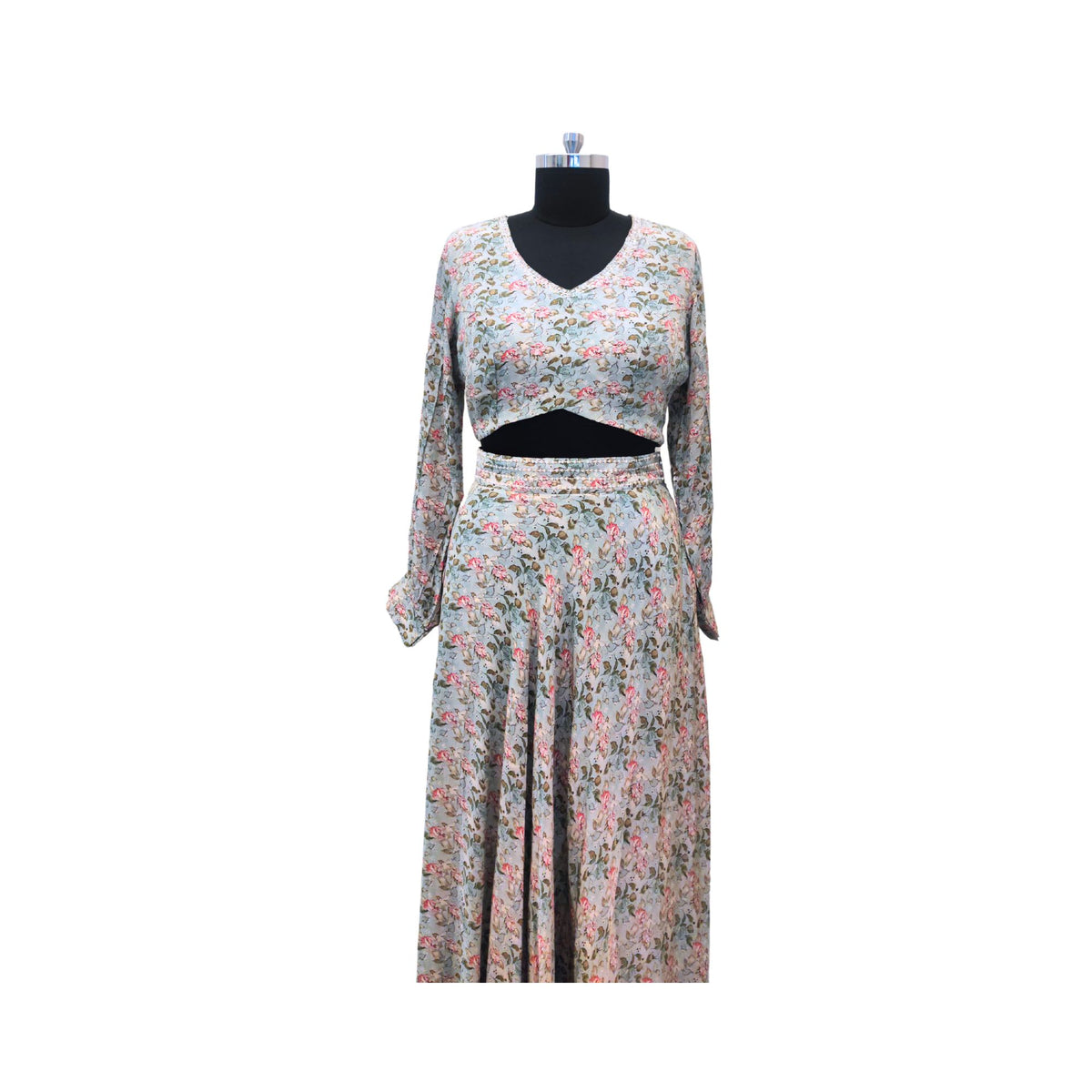 CRAPE CO-ORD SET WITH DIGITAL PRINT, SEQUINS NECKLINE WITH DIGITAL PRINT WITH FRILL