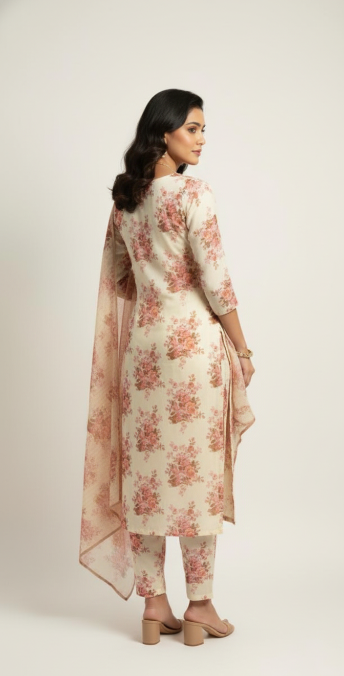 Linen suit featuring a delicate floral print, paired with an organza dupatta adorned with matching floral motifs, creating a graceful and stylish ensemble perfect for everyday elegance.