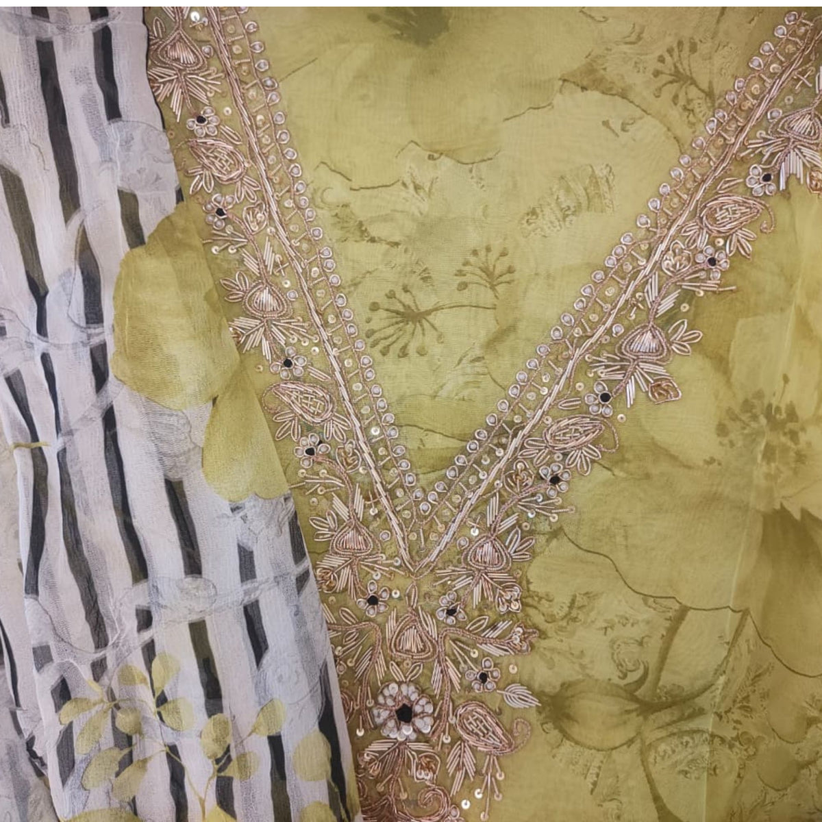 ORGANZA PRINTED UNSTITCH SUIT ADORNED WITH HAND EMBROIDERY, PAIRED WITH CHIFFON PRINTED DUPATTA