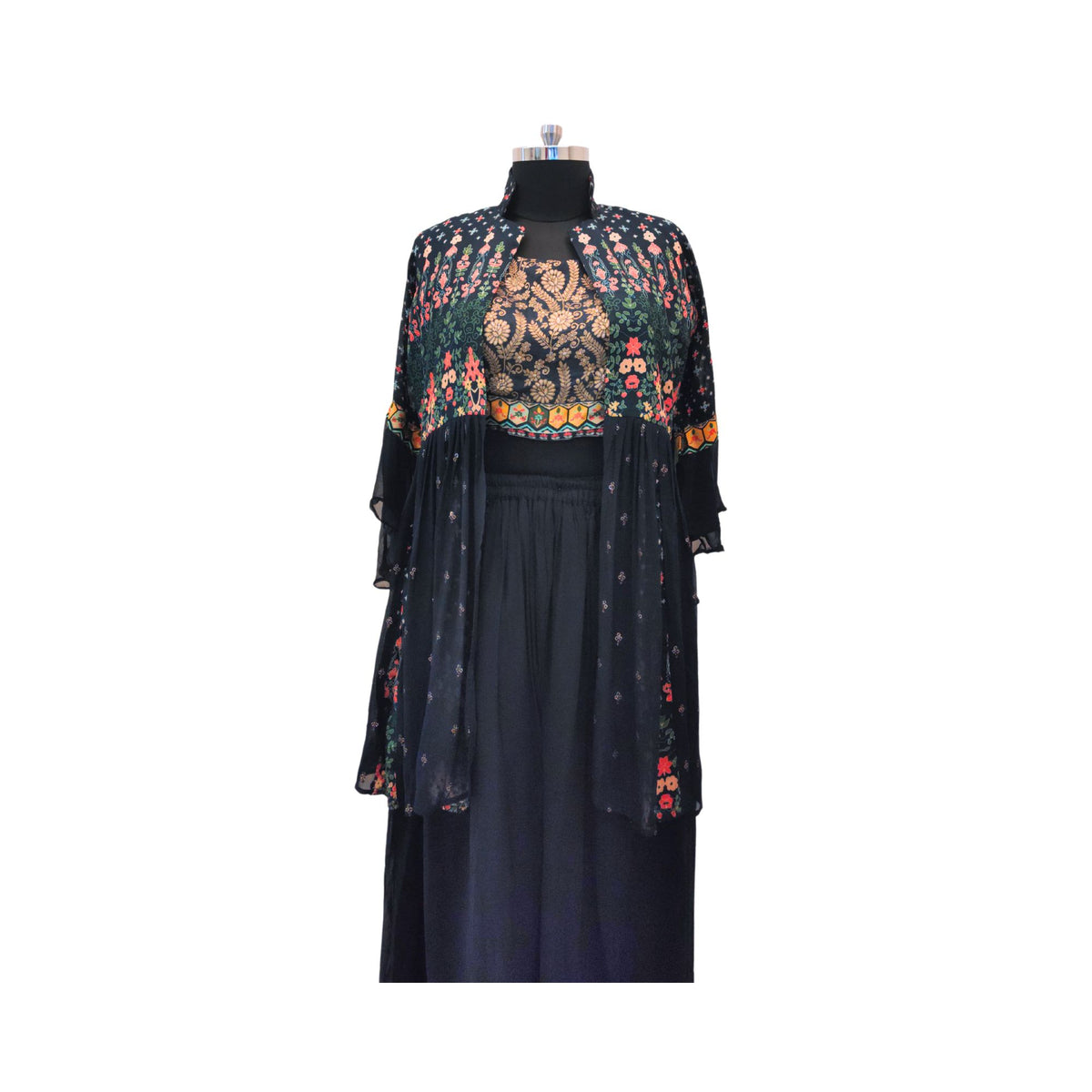 GEORGETTE CROP TOP AND PALLAZO WITH JACKET,FEATURING ZARI WORK ON CROP TOP WITH PRINTED JACKET