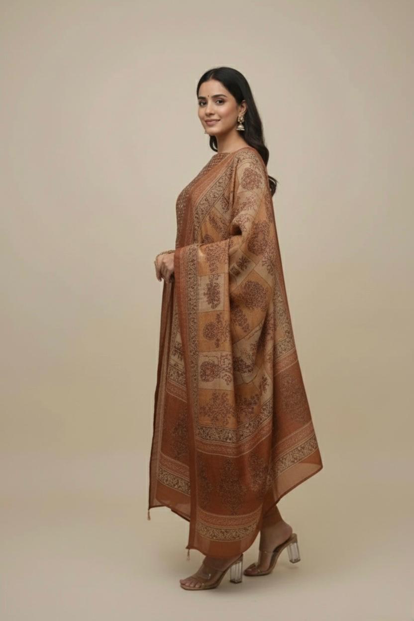 This is an elegant and culturally rich unstitched suit set, featuring a unique silk blend fabric, traditional mirror work, and a complementary printed dupatta.The mirror work is concentrated on the yoke/neckline area in a prominent, vertical panel. The mirrors are arranged in decorative lines, flanking a central stem-like design, giving it a festive and traditional Rajasthani/Kutchi appeal.
