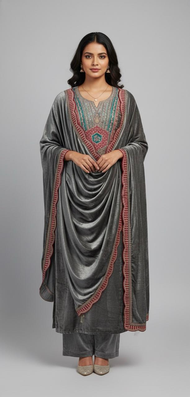 VELVET SUIT WITH GOLDEN EMBROIDEY, PAIRED WITH MAROON AND GREEN EMBROIDER VELVET DUPATTA