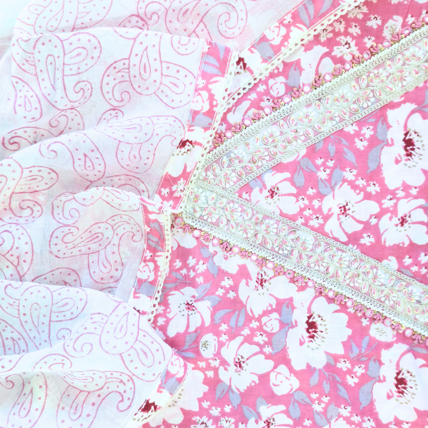 PINK V NECK EMBROIDER COTTON UNSTITCHED SUIT