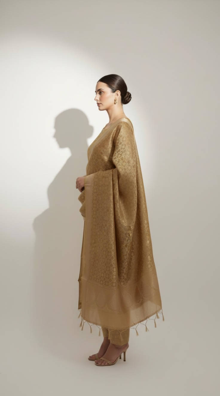 This brocade suit showcases intricate jal weaving that adds a rich, traditional charm to the ensemble. It is beautifully paired with a crushed tissue dupatta, offering a soft sheen and graceful drape. A perfect pick for women who love timeless elegance with a touch of luxury.