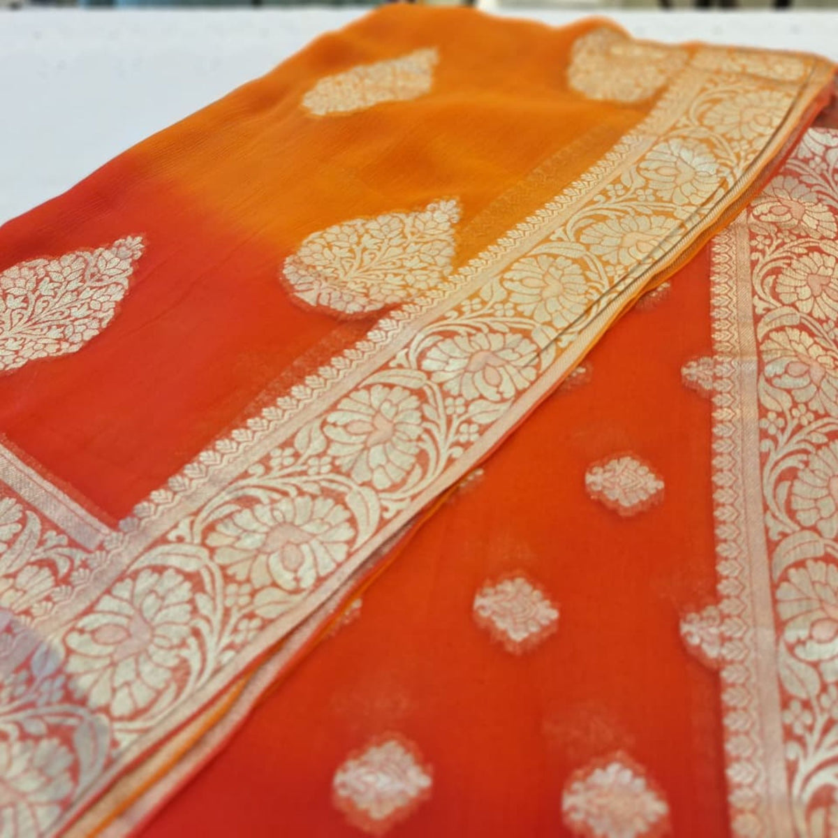 This radiant chiffon saree in a 2D dual-shade palette beautifully blends vibrancy with elegance. The rich orange hue merges seamlessly with lighter undertones, creating a striking yet soft gradient effect. Lightweight and flowy, the chiffon fabric drapes effortlessly, enhancing the wearer’s silhouette with a graceful fall. The saree is adorned with delicate golden motifs and a finely woven zari border, adding a touch of traditional charm.