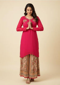 A vibrant fuschia Chinnon suit.The kurti is highlighted by exquisite gold thread embroidery and beadwork in a motif pattern concentrated around the V-neckline and chest. It is paired with wide-legged palazzos in a contrasting, intricate digital print featuring paisley and border patterns