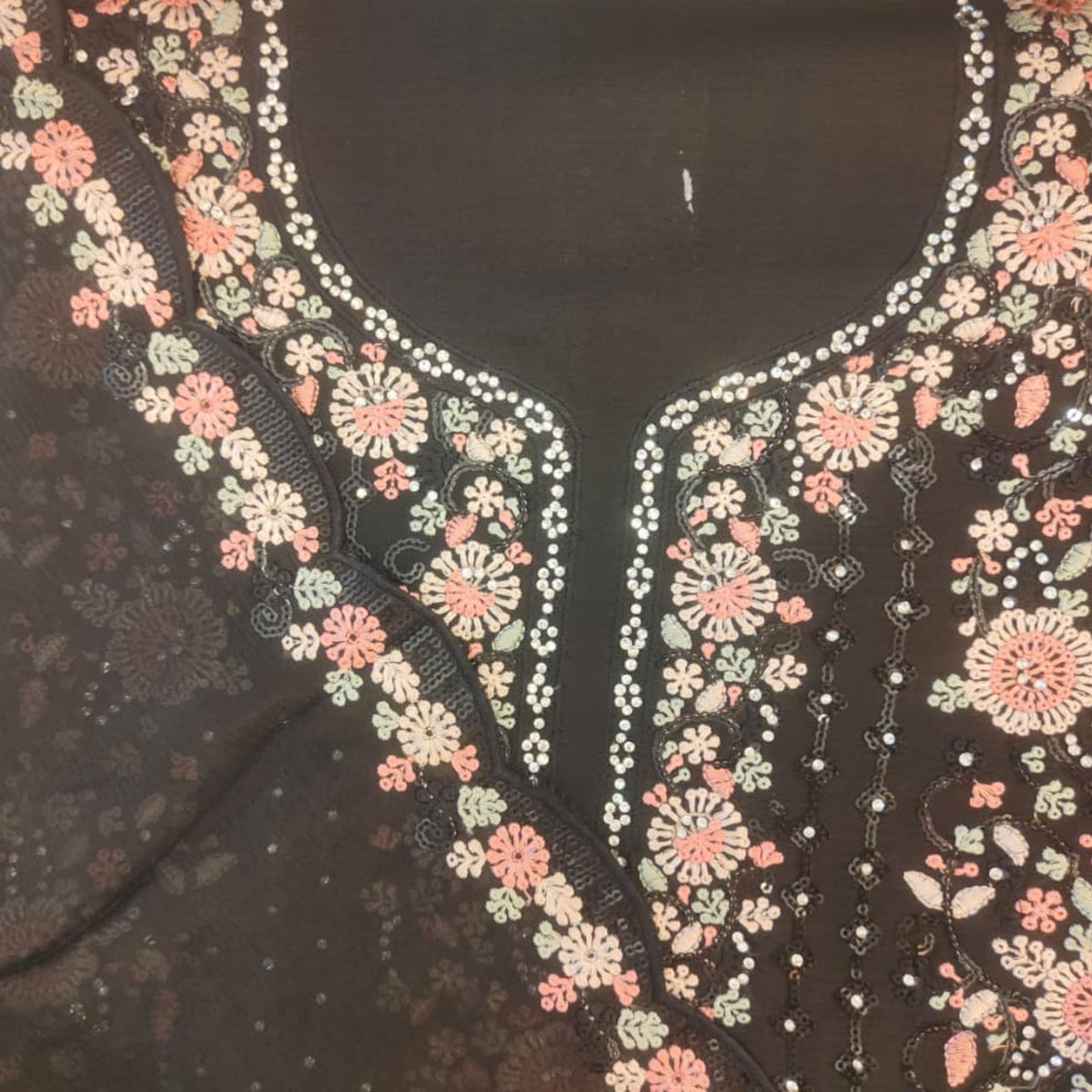 Unstitched fabric for the top. The neckline is heavily embellished with intricate Zari/multi-thread.Made of Chinnon or a similar sheer, flowing fabric. It is highlighted by a distinctive scalloped border.