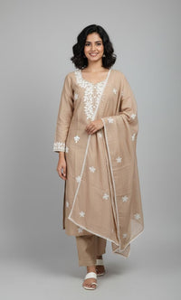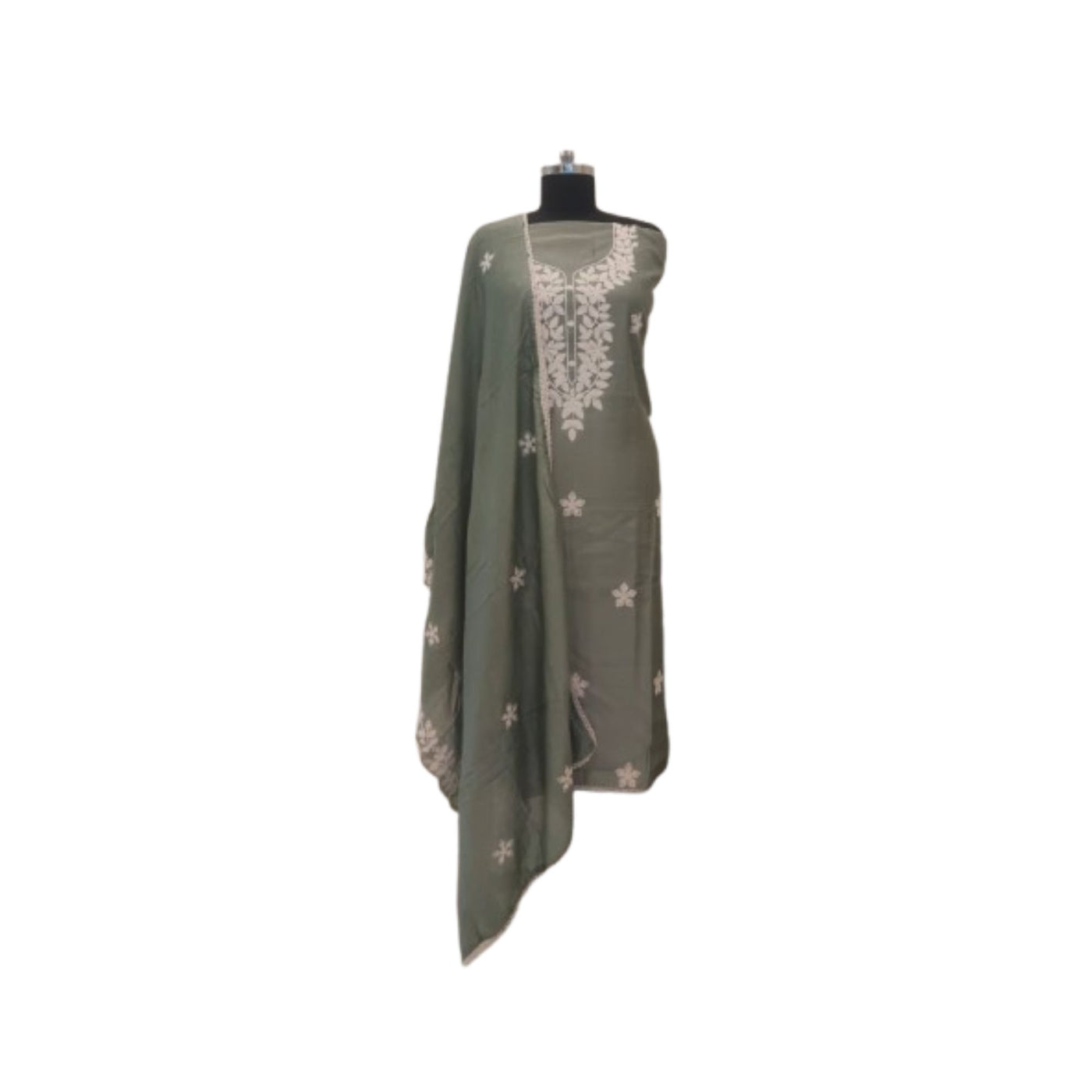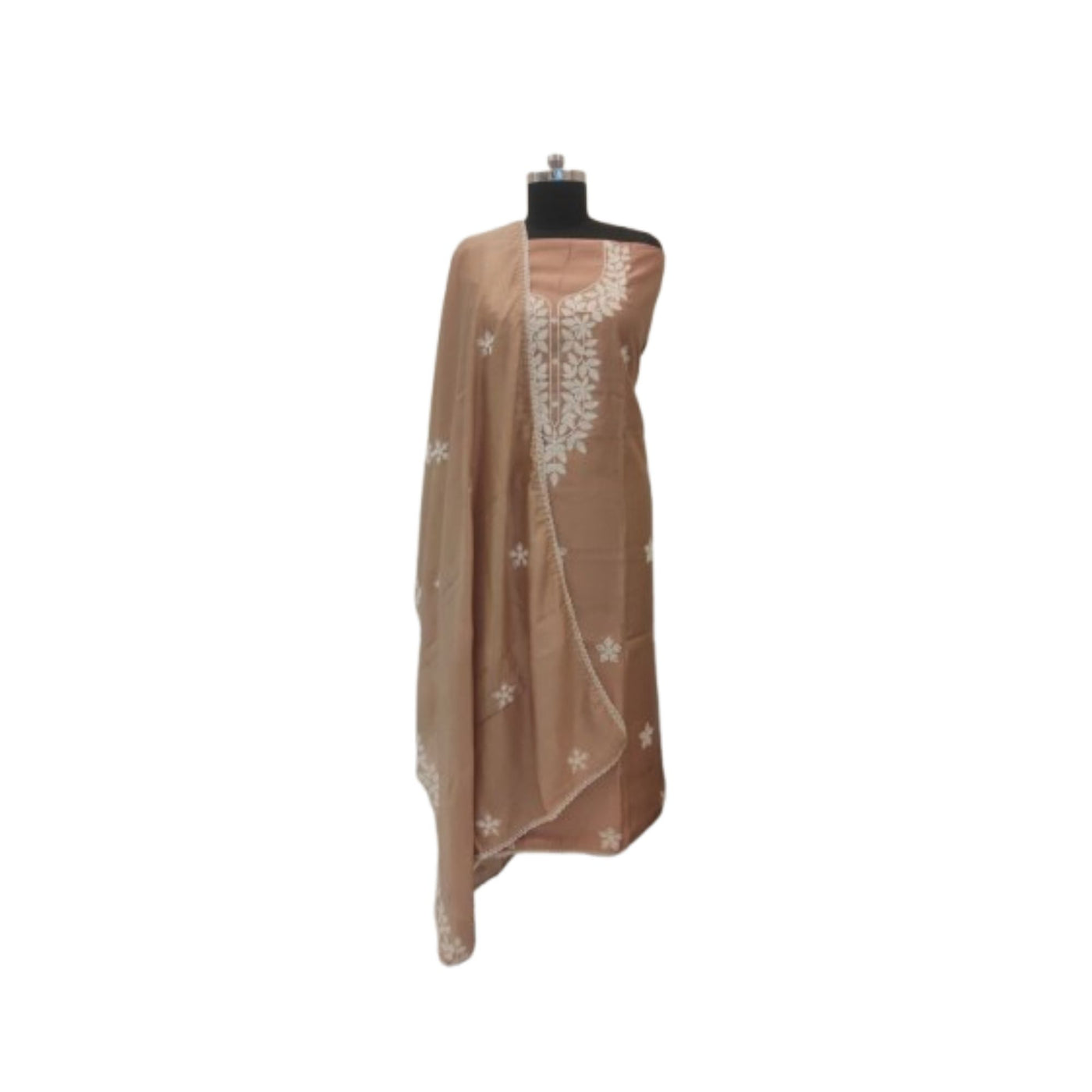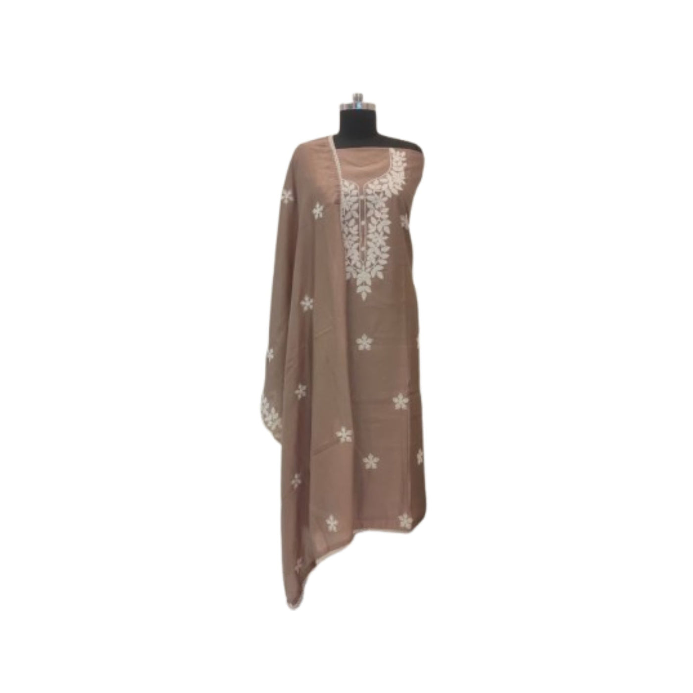 The neckline area is heavily embellished with a dense, symmetrical floral and leaf pattern that forms a bib or yoke-like design. The design includes fine detailing and a scalloped or lace-like border along the edges of the embroidery panel.