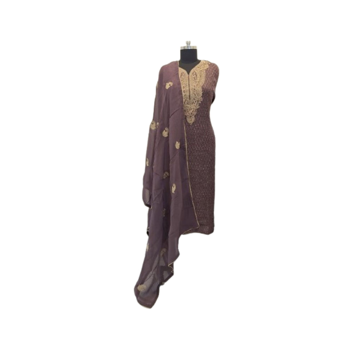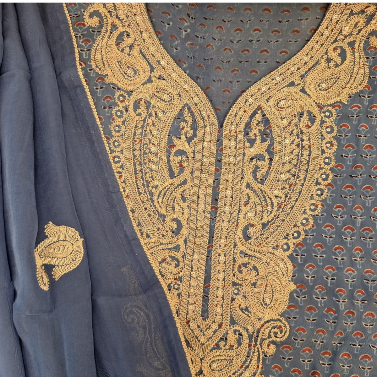 The highlight is the elaborate zari embroidery around the V-neckline, extending down the front. This intricate gold-toned embroidery showcases traditional motifs, possibly paisleys or florals, adding a luxurious and festive touch.