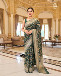 This exquisite Chicago print silk saree is a masterpiece of elegance and tradition. Crafted in rich green silk, it features intricate golden motifs inspired by heritage patterns, giving it a regal and timeless appeal. The saree is adorned with a contrasting silver-golden border that enhances its grandeur, making it perfect for festive occasions, weddings, or royal gatherings.