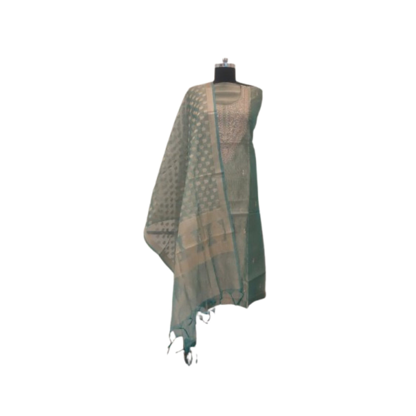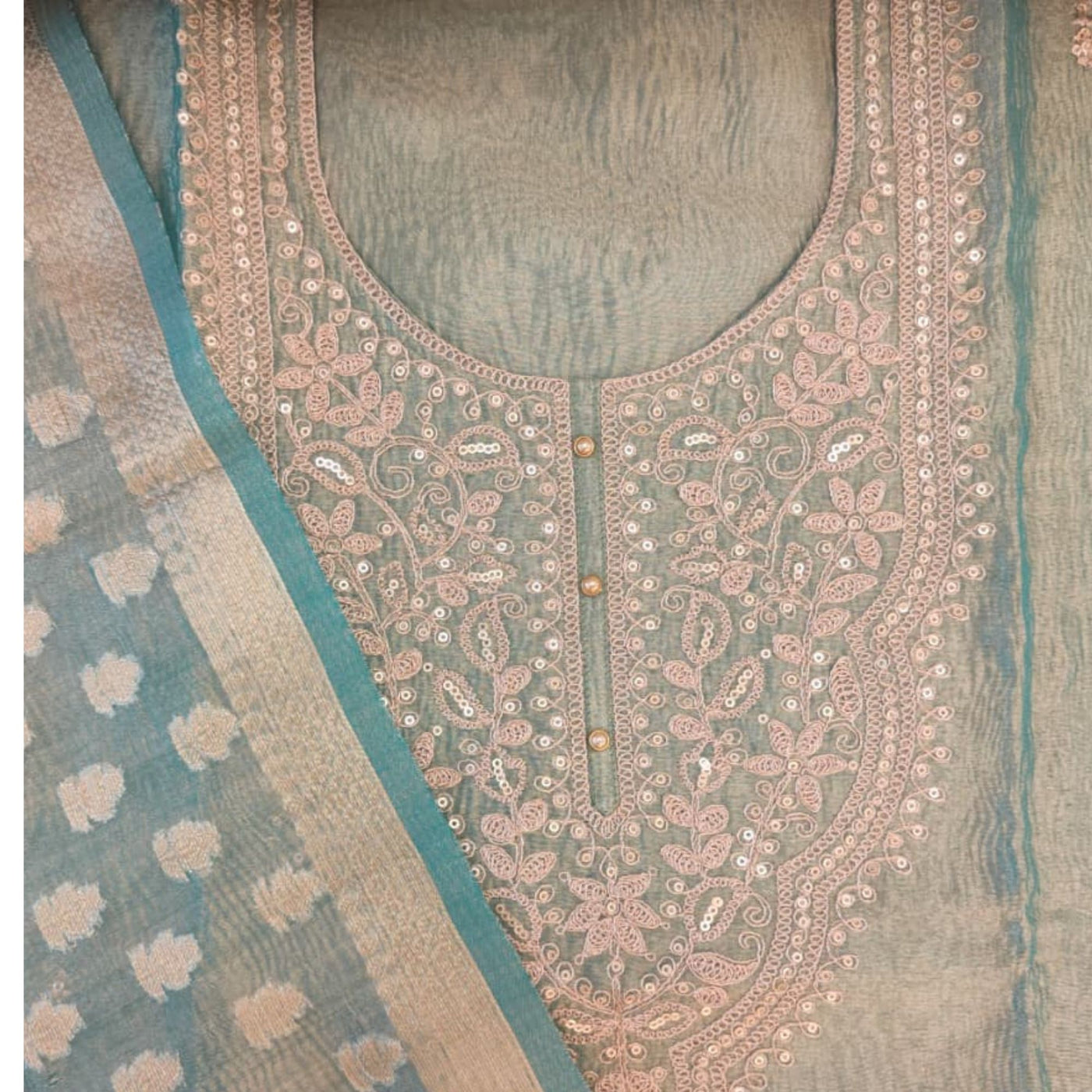 This is a stunning unstitched suit set crafted from sheer Tissue fabric, offering a delicate drape and a subtle, luxurious shimmer, perfect for festive or semi-formal occasions.The highlight is the dense and elaborate machine embroidery on the yoke/neckline.
