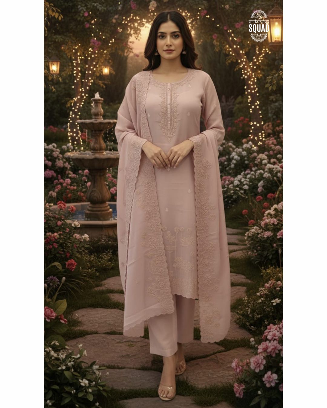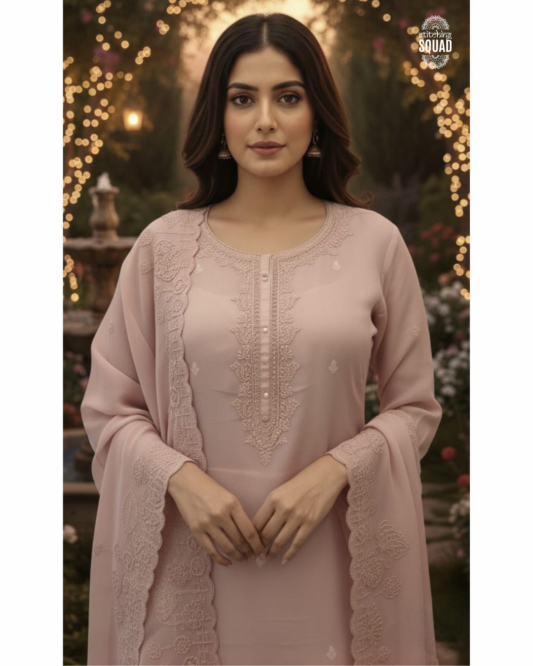 Crafted in luxurious organza fabric, this suit features subtle self-colour cord work highlighting the neckline for an elegant and refined look. The ensemble is paired with a beautifully scalloped organza dupatta, delicately embellished with matching cord work, adding a soft statement to the overall silhouette. A perfect blend of minimal charm and graceful craftsmanship, ideal for festive gatherings and special occasions.